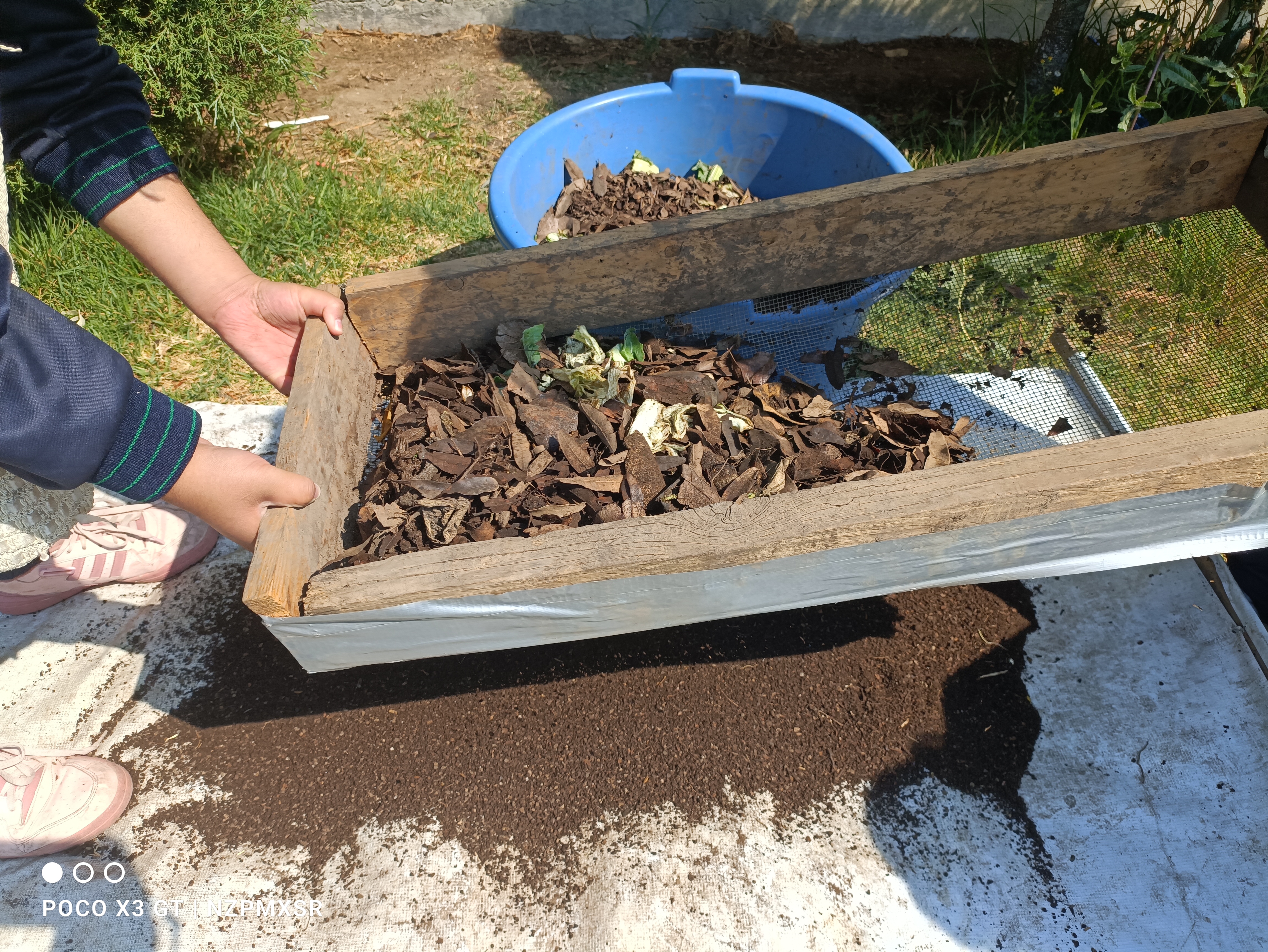 En este paso usaremos un arnero para poder sacar el producto anteriormente mencionado, asi que con ayuda de 2 o mas personas vaciaremos al arnero la tierra de la lombricomposta, empezaremos a sacudir el arnero y todo lo que salga de ahi seran todos los nutrientes obtenidos.